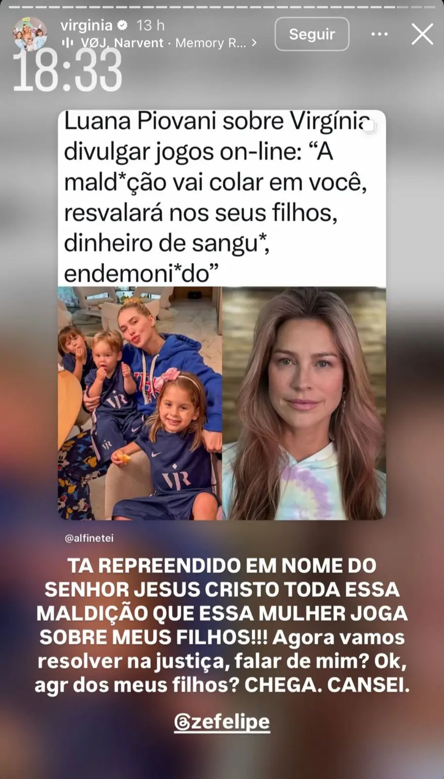 Virginia, por sua vez, reagiu com indignação ao conteúdo, especialmente pela menção aos filhos, Maria Alice, 4, Maria Flor, 3, e José Leonardo, 1. Em vídeos publicados nas redes sociais, ela apareceu chorando ao comentar o caso.