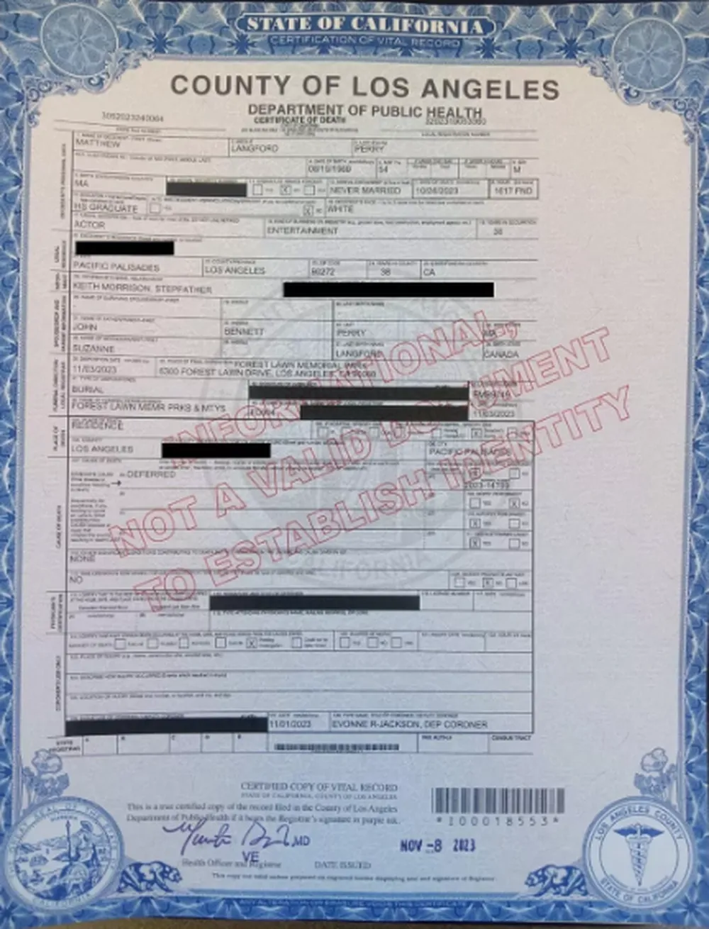 Foi divulgada a certidão de óbito de Matthew Perry, estrela de “ Friends ” que morreu em sua casa, em Los Angeles, no dia 28 de outubro, aos 54 anos. No documento consta a hora do óbito, às 16h17 (o ator foi encontrado morto numa banheira de hidromassagem em sua casa, por um assistente, que acionou o departamento de bombeiros de Los Angeles).