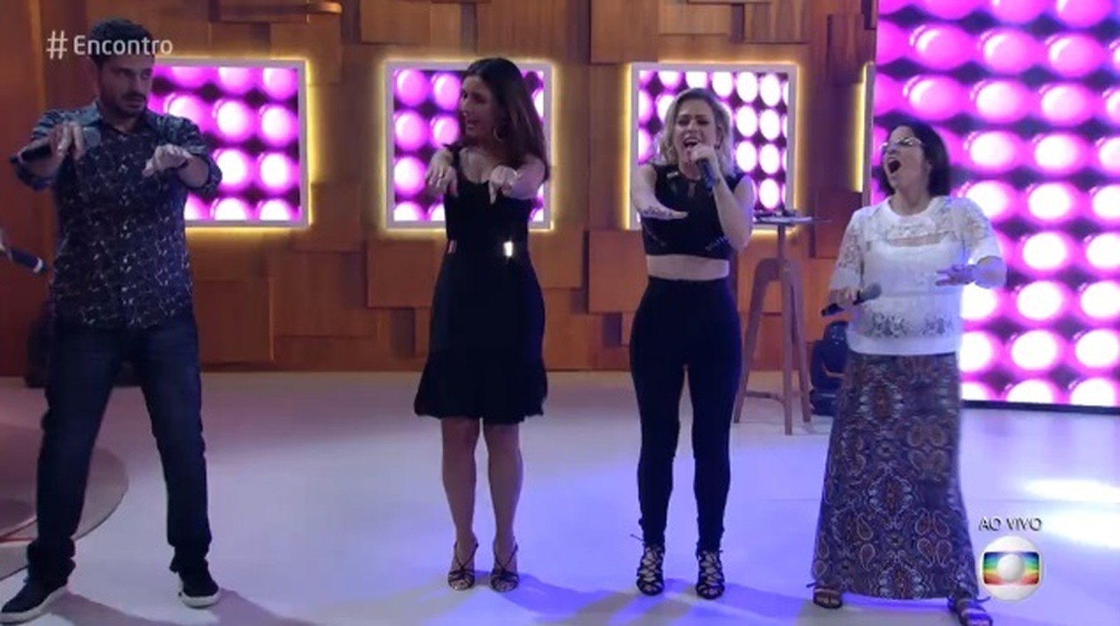 Fátima Bernardes entrou no clima e seguiu os passos das meninas do grupo Rouge, que foi ao Encontro nesta sexta-feira (16).