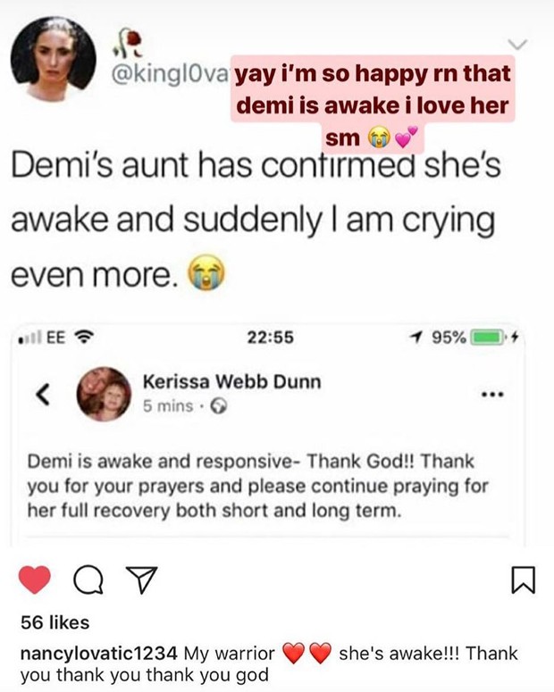 Segundo publicado pelo site norte-americano TMZ, Demi Lovato já está acordada e consciente. A cantora teve uma suposta overdose na manhã da última terça-feira (24) e foi hospitalizada. Uma tia da popstar teria postado em suas redes sociais que a artista está bem e pediu privacidade. A publicação foi printada por um fã-clube e espalhada na internet.
