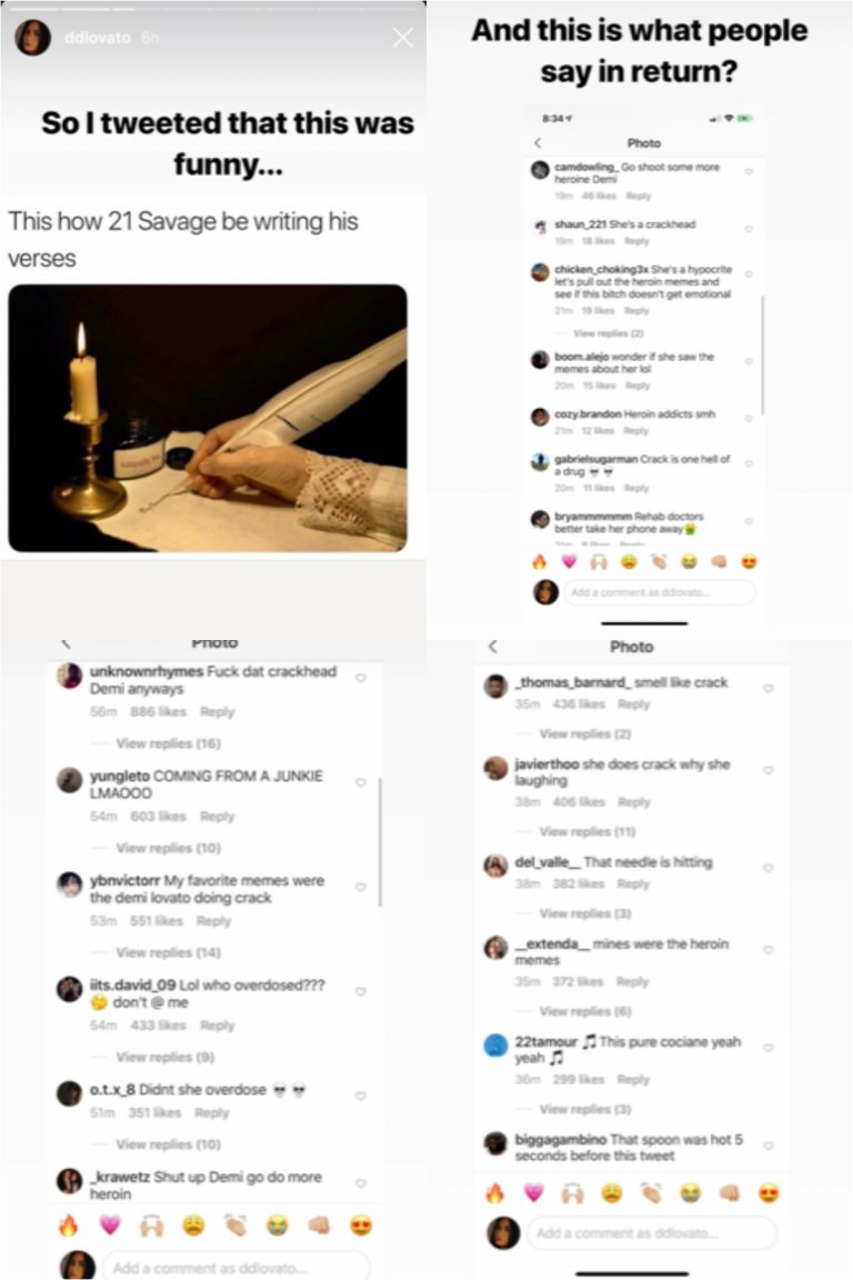 “Ela é uma usuária de crack”, escreveu um internauta. “Vá injetar um pouco mais de heroína em você, Demi”, provocou outro