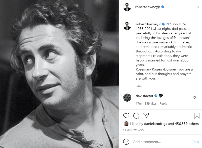 Downey Jr. postou sobre seu pai no Instagram, escrevendo “Na noite passada, meu pai passou em paz durante o sono, após anos suportando a devastação do Parkinson … ele era um verdadeiro cineasta independente”.