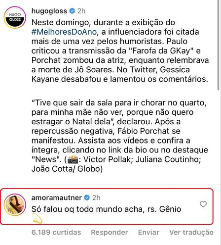 Amora Mautner, diretora de novelas da Globo como ‘Avenida Brasil‘, defendeu Fabio Porchat na polêmica com Gkay. Em um comentário no Instagram do blogueiro Hugo Gloss, Mautner chamou o humorista de “gênio” ao fazer a piada com a influencer paraibana e afirmou que o comediante “só falou o que todo mundo já sabe”.