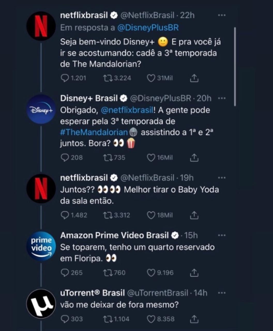 As trocas de mensagens divertidas entre as plataformas acabaram surpreendendo internautas e assinantes, que esperavam um clima de competição. A Netflix, que chegou no país em 2011, fez questão de receber carinhosamente a concorrente. “Seja bem-vindo Disney+. E pra você já ir se acostumando: cadê a 3ª temporada de ‘The Mandalorian‘?”, escreveu.