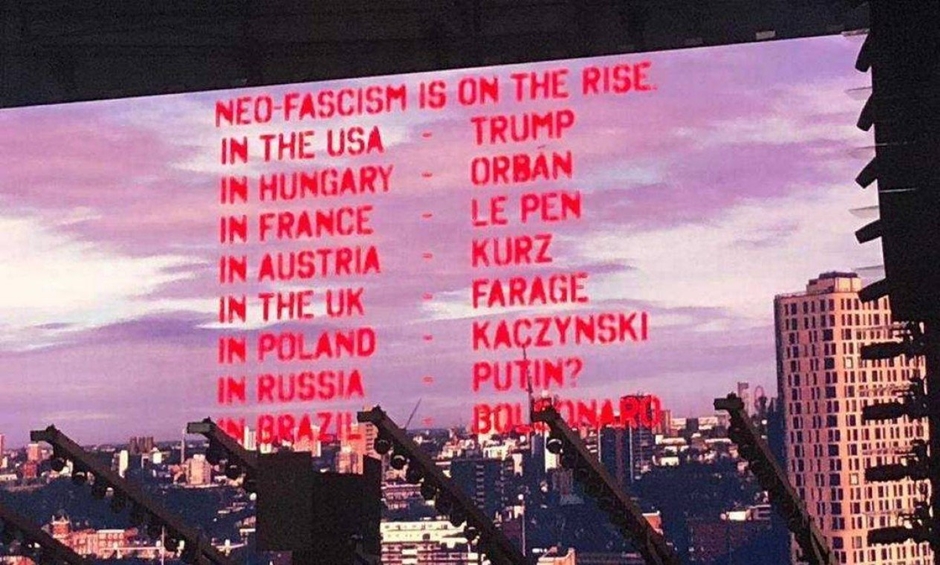 Já no intervalo, o grande telão que ocupa toda a extensão do palco exibiu vários slides com exemplos de personagens, tendências e comportamentos que merecem resistência. Em um deles, estava escrito que devemos resistir “ao neofascismo”. E, em seguida, o telão mostrou exemplos de países e líderes políticos onde o neofascismo estaria em ascensão. Um dos países citados foi o Brasil e o líder apontado é Bolsonaro.