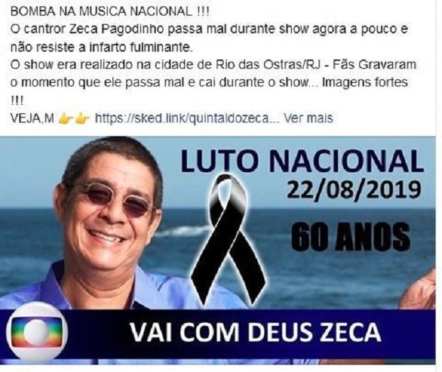 O anúncio mentiroso tem sido disseminado no Facebook e em grupos de WhatsApp, e declara luto nacional. “22/08/2019 – 60 anos – Vai dom Deus, Zeca”, diz.