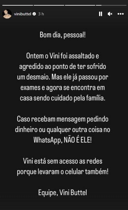 A nota oficial também fez um alerta: “Caso recebam mensagem pedindo dinheiro ou qualquer outra coisa no WhatsApp, NÃO E ELE! Vini está sem acesso as redes porque levaram o celular também!”.