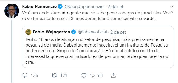 De acordo com a reportagem, Pannunzio respondeu a publicação de Wajngarten dizendo que o chefe setorial seria “um dedo-duro intrigante que só sabe pedir cabeças de jornalistas.” Ao portal, Wajngarden negou que pediu demissão de jornalistas e que não seria a primeira vez que era atacado pelo ex-âncora do jornal de fim de noite da Band. Além disso, alegou desconhecer os motivos para tal ataque.