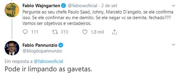 Ao jornalista, Wajngarten fez uma aposta: “Pergunte ao seu chefe Paulo Saad, Johnny Saad e Marcelo D’Angelo se ele confirma isso. Se ele confirmar eu me demito. Se ele negar você se demite, fechado? Vamos ser objetivos e verdadeiros”, disse. Pannunzio respondeu que o secretário poderia “limpar suas gavetas.”