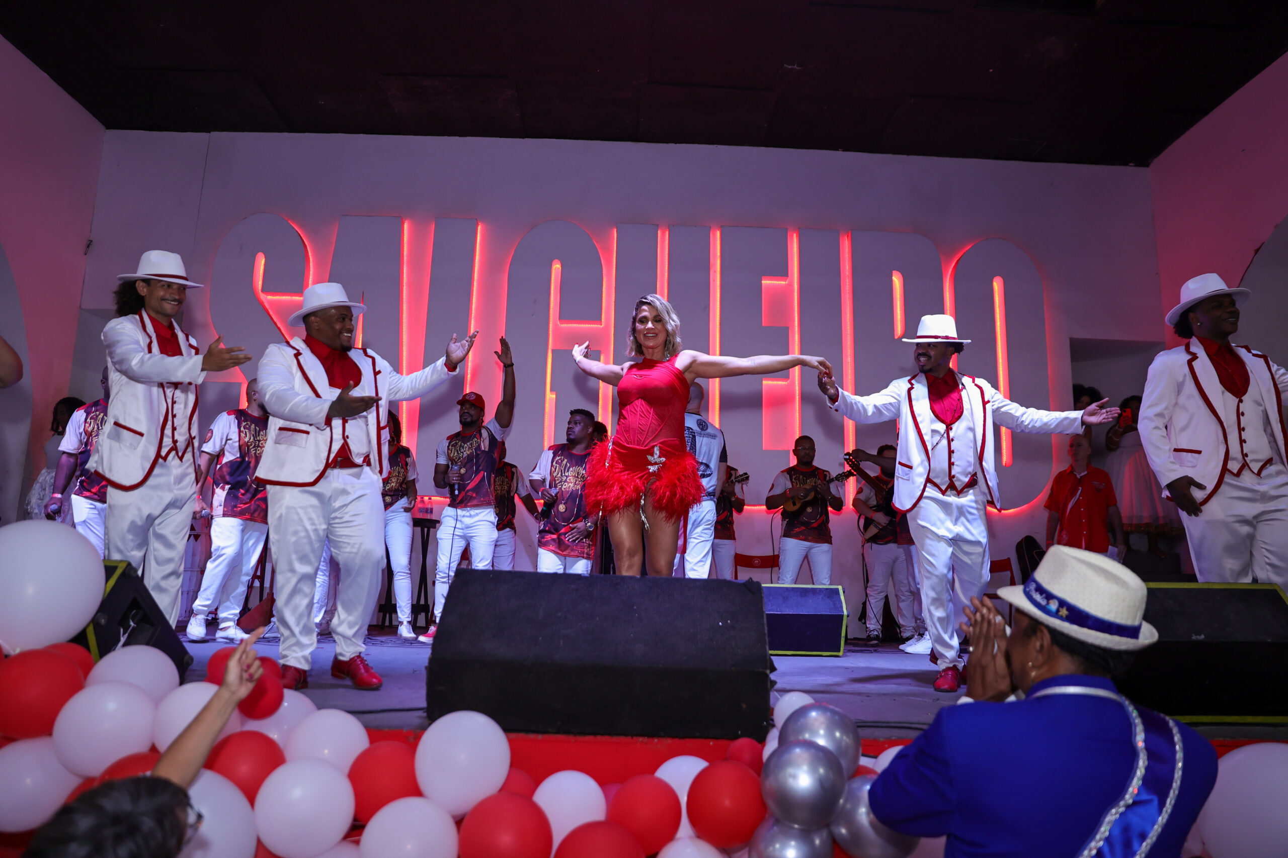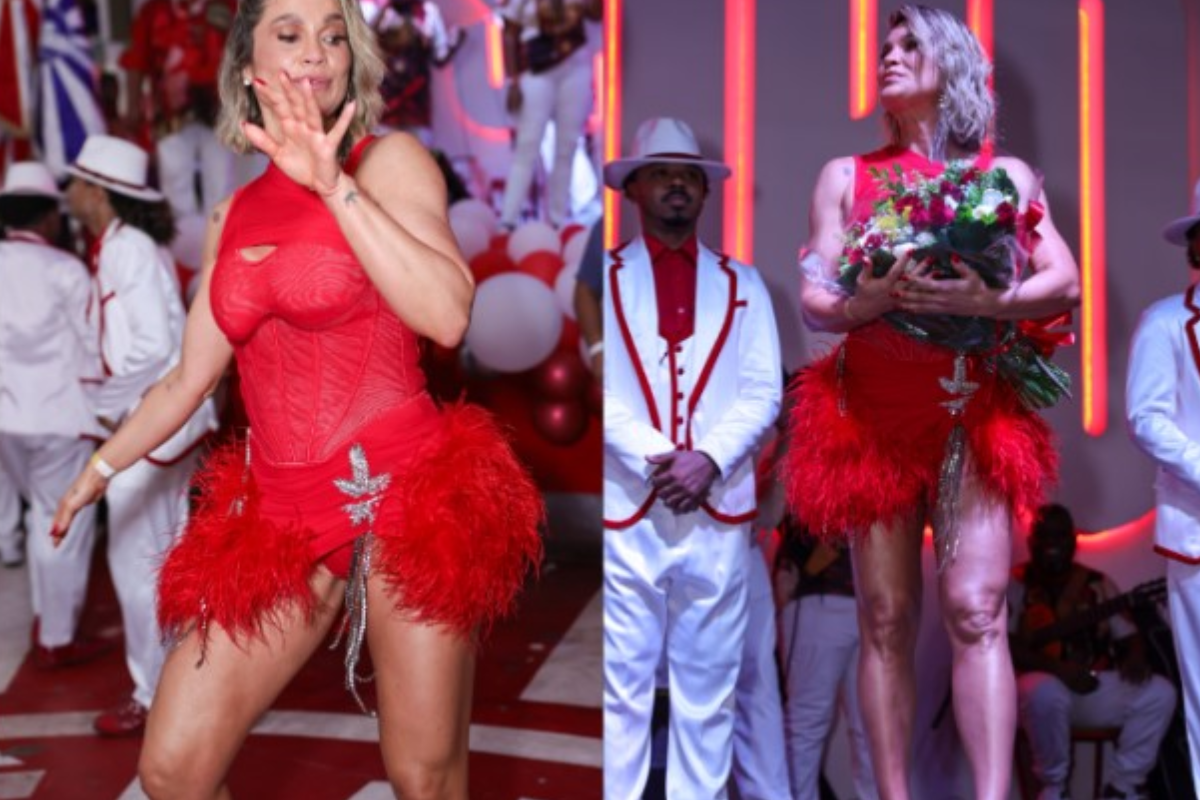 Flávia chamou atenção não apenas por ser a estrela do evento, mas pela beleza que ostentou. Com um vestido vermelho curto, ela se jogou no samba ao lado de passistas da escola e sob o comando de Carlinhos Salgueiro. A atriz também ganhou um buquê de rosas vermelhas das mãos da matriarca da Salgueiro, Tia Glorinha.