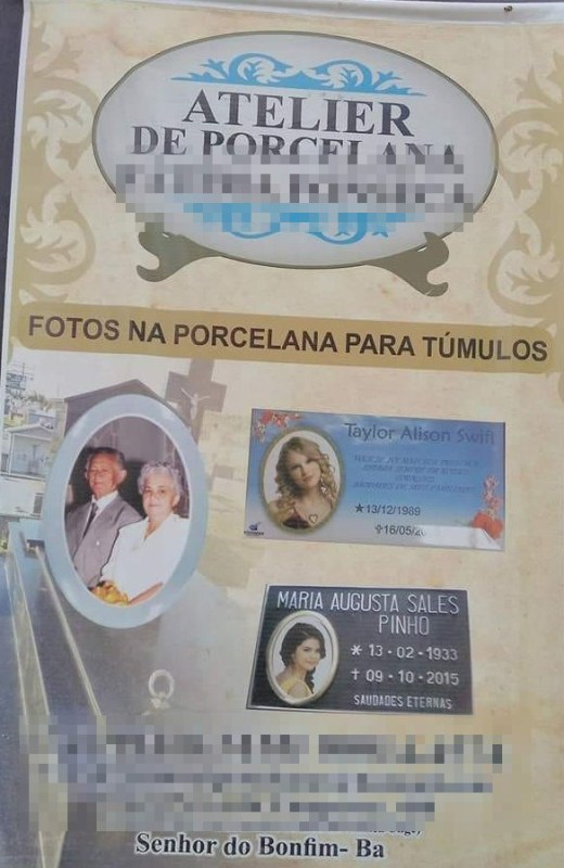 Depois de aparecer em um banner do PSDB de Sergipe, Selena Gomez foi garota-propaganda de um ateliê de Senhor do Bonfim, Bahia. Ela e a cantora Taylor Swift apareceram em um anúncio de porcelana para túmulos que começou a circular nas redes sociais.