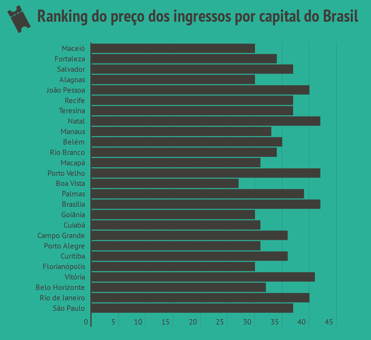 Representado por Goiânia, o estado tem a média de ingresso de R$ 30. No Brasil, a média do valor oscila entre R$28,61 e R$31,58.