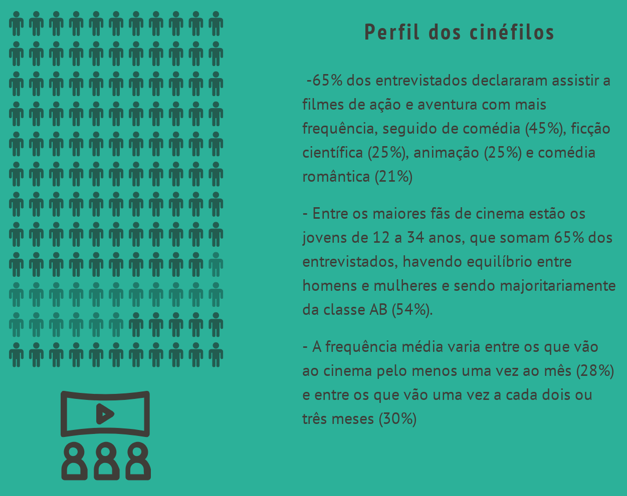 Num levantamento realizado pelo IBOPE Media, entre os cinéfilos entrevistados, 28% vai ao cinema pelo menos uma vez ao mês. E 30% a cada dois ou três meses.