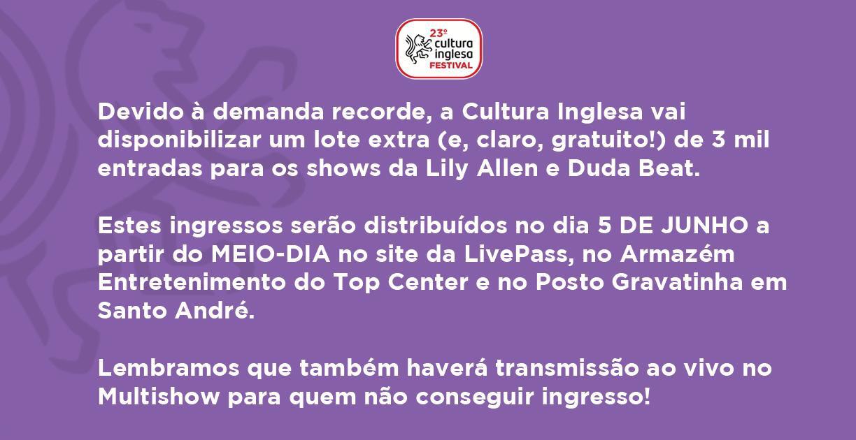 Os ingressos para o Cultura Inglesa Festival ficaram disponíveis nesta segunda (27), a partir das 12h, e se esgotaram em menos de duas horas. O evento organizado pela escola de idiomas terá como atrações musicais principais a cantora britânica Lily Allen e a brasileira Duda Beat, em 9 de junho, no Memorial da América Latina (zona oeste de São Paulo).