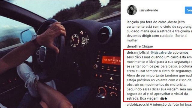 Isis Valverde compartilhou em seu Instagram a foto de uma viagem com seu namorado. Na imagem, ele dirige, quando ela coloca os pés em seu colo. Na legenda, lê-se “I wish! On the road with love!”: “Eu desejo! Na estrada, com amor”, em tradução livre. O Departamento de Trânsito do Estado do Rio de Janeiro (Detran) viu a postagem e utilizou o espaço para “puxar a orelha” da atriz.