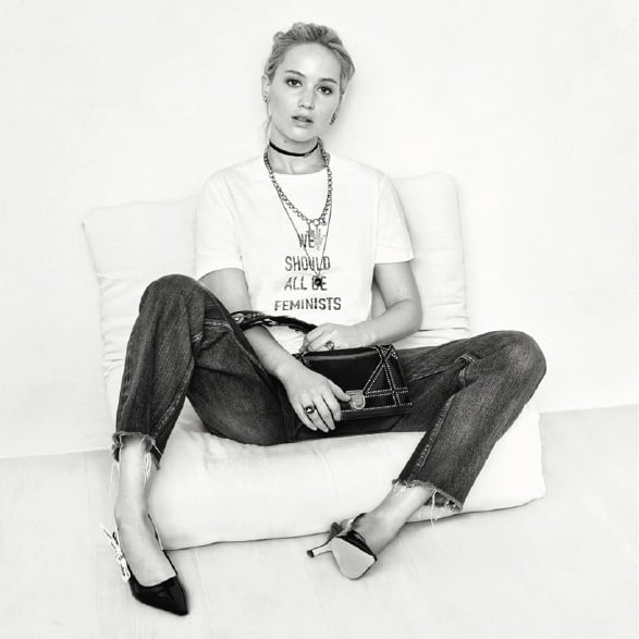 Parte do catálogo da Dior desde 2012, a atriz Jennifer Lawrence está nas novas fotos para o catálogo de outono da marca. Em uma das fotos, ela manda um recado, estampado em uma das camisetas: “todos nós devemos ser feministas”.