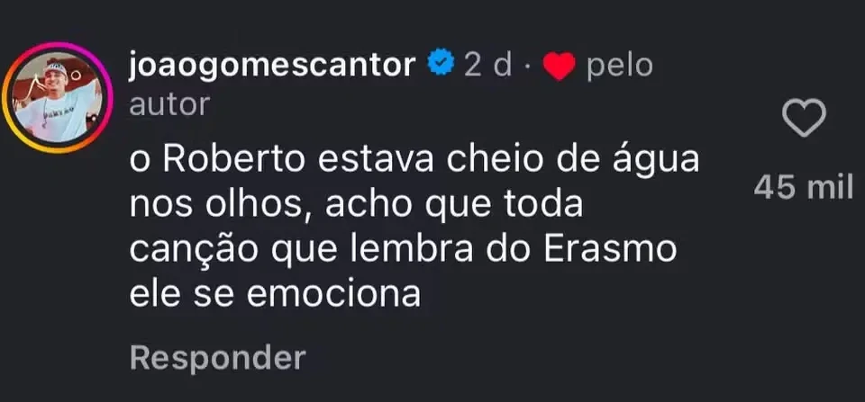 “O Roberto estava cheio de água nos olhos, acho que toda canção que lembra do Erasmo ele se emociona”, escreveu o cantor. A declaração faz referência a Erasmo Carlos, parceiro musical e amigo de longa data de Roberto, que morreu em 2022.