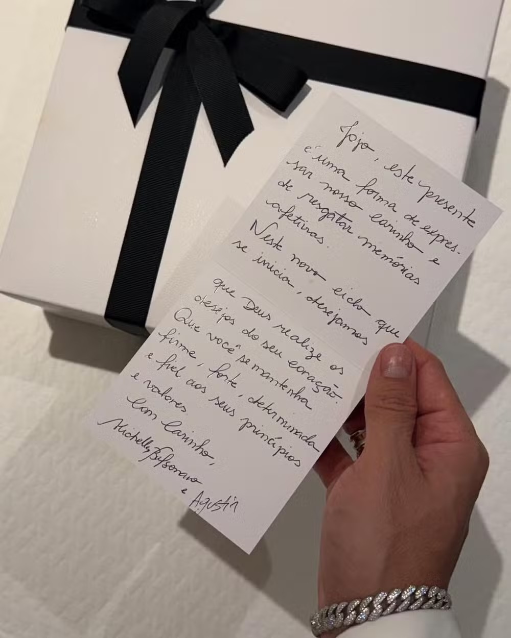 “Jojo, este presente é uma forma de expressar nosso carinho e resgatar memórias afetivas. Neste novo ciclo que se inicia, desejamos que Deus realize os desejos do seu coração. Que você se mantenha firme, forte, determinada e fiel aos seus valores”, escreveu a ex-primeira-dama.