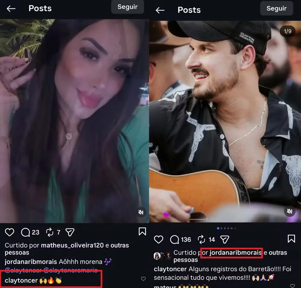 Com isso, internautas chegaram rapidamente a Clayton, da dupla Clayton & Romário, nome bastante conhecido no cenário sertanejo de Goiânia. Além de seguir o artista, Jordana também interage com conteúdos ligados ao cantor. Os dois já trocaram likes em diversas publicações.