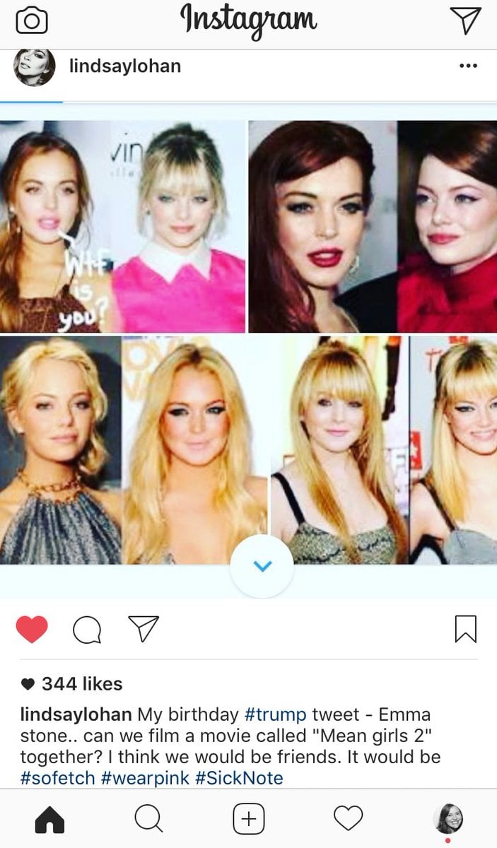 No Instagram, LiLo postou uma série de imagens comparando-se à protagonista de La La Land, mostrando que há certa semelhança entre as duas. “Emma Stone, podemos gravar um filme chamado ‘Meninas Malvadas 2’ juntas?”, escreveu Lohan. A postagem foi apagada pouco tempo depois.