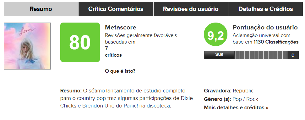 O site Metacritic, que compila críticas de jornalistas especializados, mostra que, até o momento, Taylor é aclamadíssima. O álbum está com média de 80 pontos. Para comparação: “Fearless” tem média de 73 pontos e “1989” tem média de 76 pontos. Os dois foram eleitos Álbum do Ano no Grammy Awards.