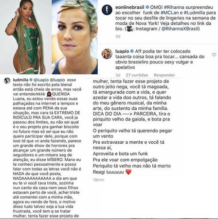 Usando as redes sociais, Luana Piovani comentou em um post de site de notícias E! Online o que achou de Rihanna ter escolhido funk para tocar em um desfile que organizou. “Podia ter colocado tanta coisa boa”, escreveu. “Cansada do óbvio, brasileiro pouco sexy, vulgar e apelativo”, continuou. Dentre a lista de faixas, estava uma de Ludmilla, que respondeu o comentário da atriz.