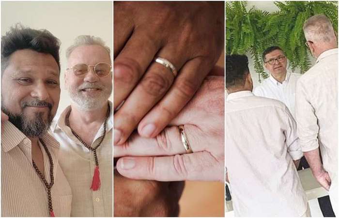 Nas fotos, compartilhadas nas redes sociais do ator, eles aparecem emocionados e mostram as alianças que selaram a união