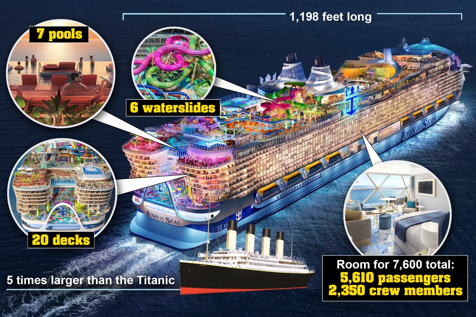Um estaleiro finlandês está finalizando os detalhes do “Icon of the Seas” (“Ícone dos Mares”), o maior cruzeiro do mundo, com previsão de sua primeira viagem para janeiro de 2024. A embarcação, encomendada pela Royal Caribbean, possui características que se assemelham mais a uma pequena cidade do que a um navio, incluindo vários parques aquáticos e mais de 20 decks. Sua capacidade é de quase 10.000 pessoas, cinco vezes maior que o Titanic.