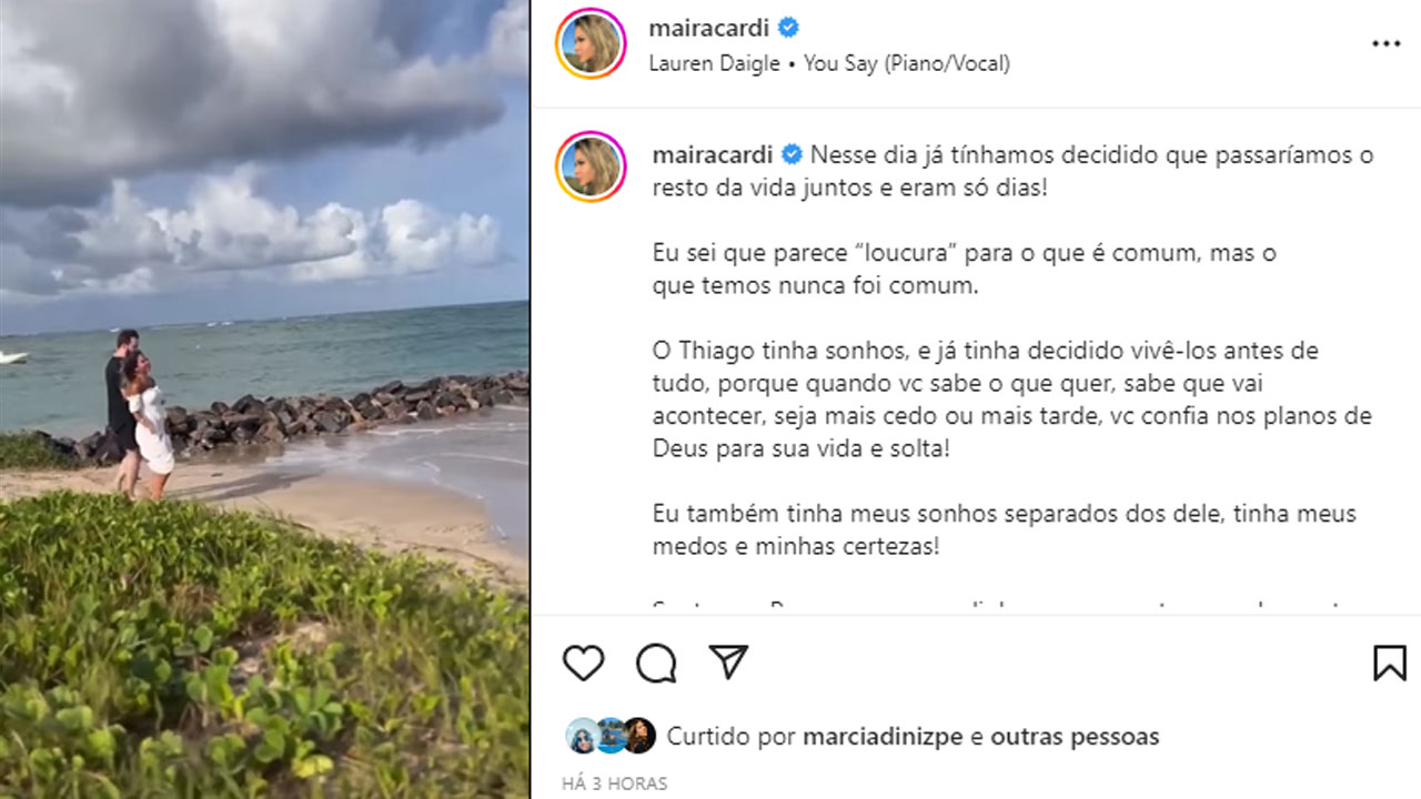 Maíra Cardi, 39, se declarou para seu novo namorado, Thiago Nigro, o Primo Rico, nas redes sociais. Ela escreveu um textão se derretendo pelo empresário.