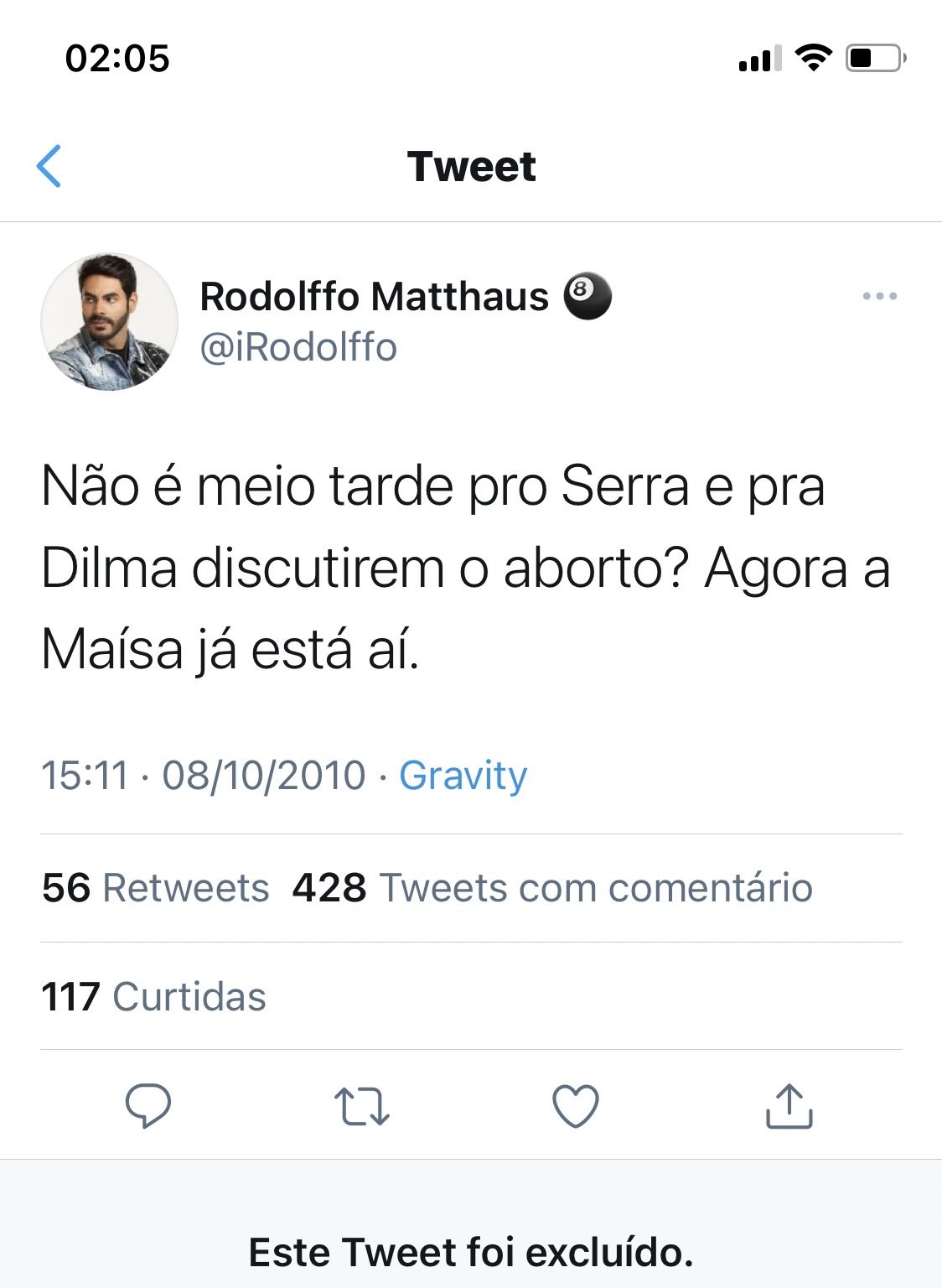 Na publicação, datada de 2010, Rodolffo teria tentado fazer piada com José Serra (PSDB), Dilma Rousseff (PT) e Maisa. “Não é meio tarde pro Serra e pra Dilma discutirem aborto? Agora a Maisa já está aí”, escreveu.