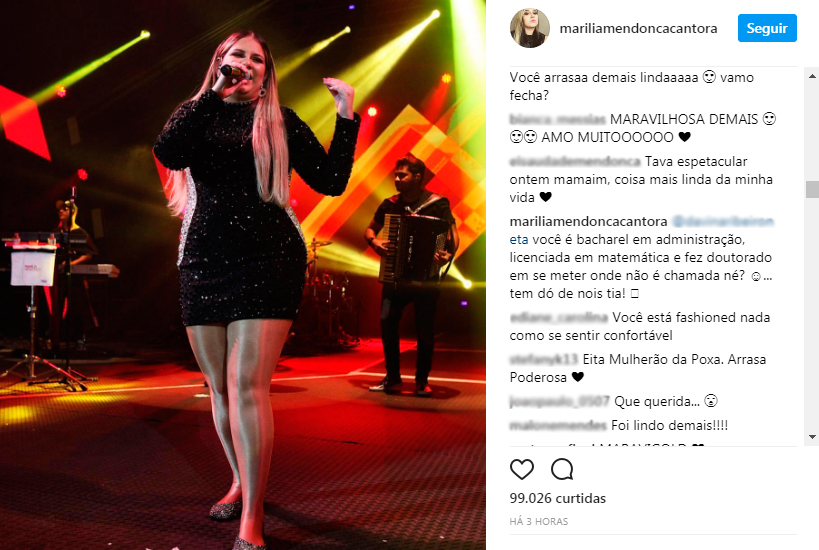 Em agosto deste ano, ela deu puxão de orelha em mais um seguidor no Instagram. Mendonça publicou uma foto de um show que fez no Rio de Janeiro e uma pessoa comentou: “o que o Photoshop não faz”.