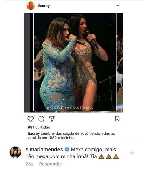 A postagem chegou até Simaria, que saiu em defesa de Simone. “Mexa comigo, mas não mexa com minha irmã”, comentou a cantora na imagem e usou emojis de fezes. Além disso, a cantora ainda gravou um vídeo para o Stories em que rebate a postagem negativa e critica quem postou.