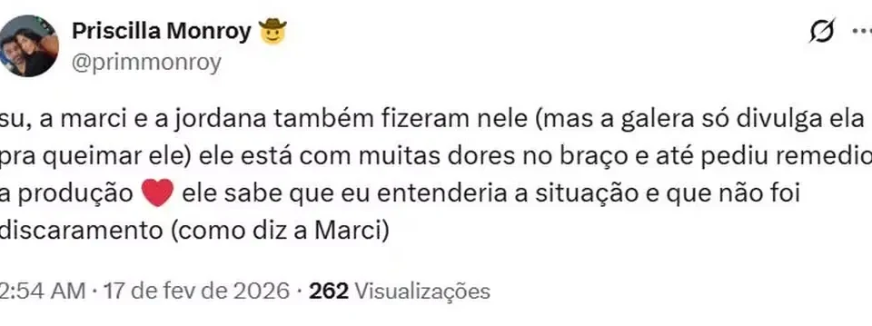A cena repercutiu nas redes sociais, principalmente pelo fato de Cowboy ser casado com Priscilla Monroy. Diante da movimentação, a esposa do participante usou o X (antigo Twitter) para comentar o episódio e contextualizar a situação.