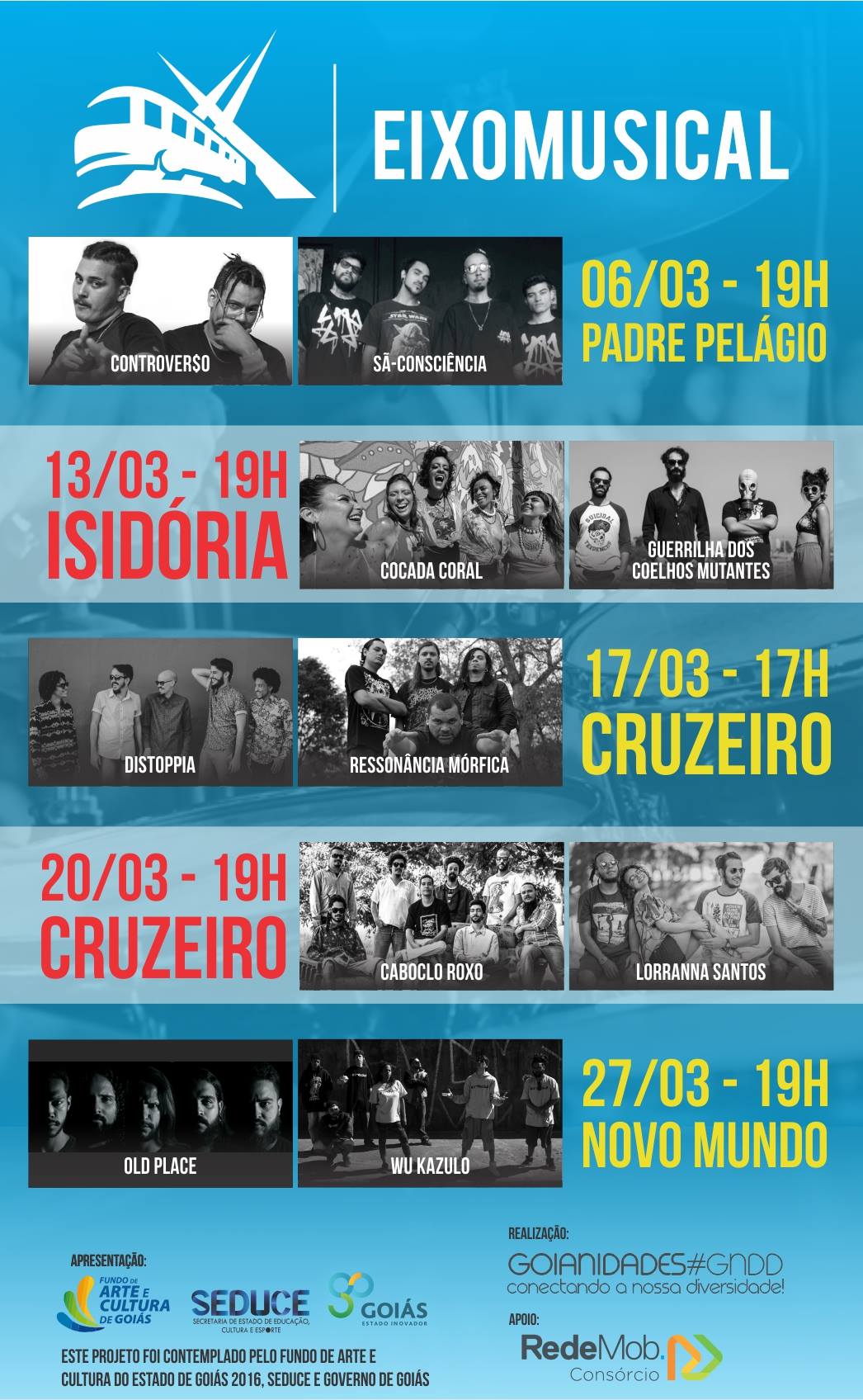 Todos os espetáculos são gratuitos e contemplam bandas e diversos estilos, do rap da Sã Consciência ao death metal da Ressonância Mórfica. A proposta é exatamente essa: de dar uma nova opção popular e variada de música para a população goianiense que depende do transporte público. Confira a programação completa abaixo.
