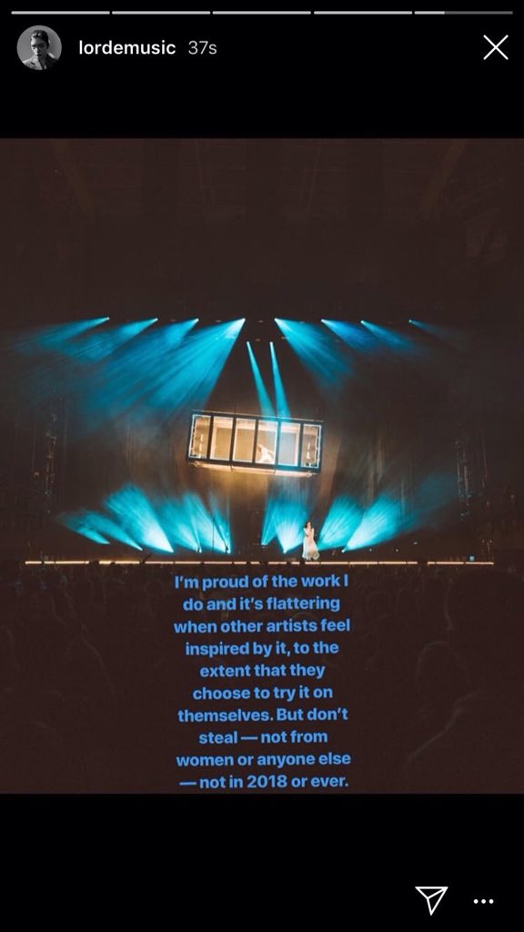 Usando o Instagram Stories nesta segunda-feira (12), Lorde publicou uma sequência de fotos dos dois palcos. Na última publicação, deixou um recado. “Tenho orgulho do trabalho que faço, e fico lisonjeada quando outro artista se sente inspirado por isso, na medida em que eles escolhem experimentá-lo nas suas produções. Mas não roube – não de mulheres, ou de quem quer que seja – nem em 2018, nem nunca”, lê-se.
