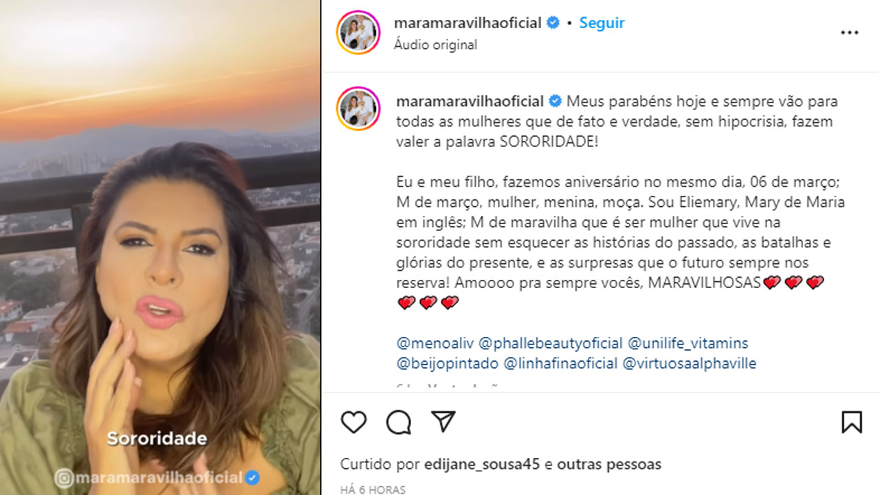 “Meus parabéns hoje e sempre vão para todas as mulheres que de fato e verdade, sem hipocrisia, fazem valer a palavra sororidade!”, escreveu na legenda. “Eu e meu filho fazemos aniversário no mesmo dia, 06 de março; M de março, mulher, menina, moça. Sou Eliemary, Mary de Maria em inglês; M de maravilha que é ser mulher que vive na sororidade sem esquecer as histórias do passado, as batalhas e glórias do presente, e as surpresas que o futuro sempre nos reserva! Amo pra sempre vocês”.