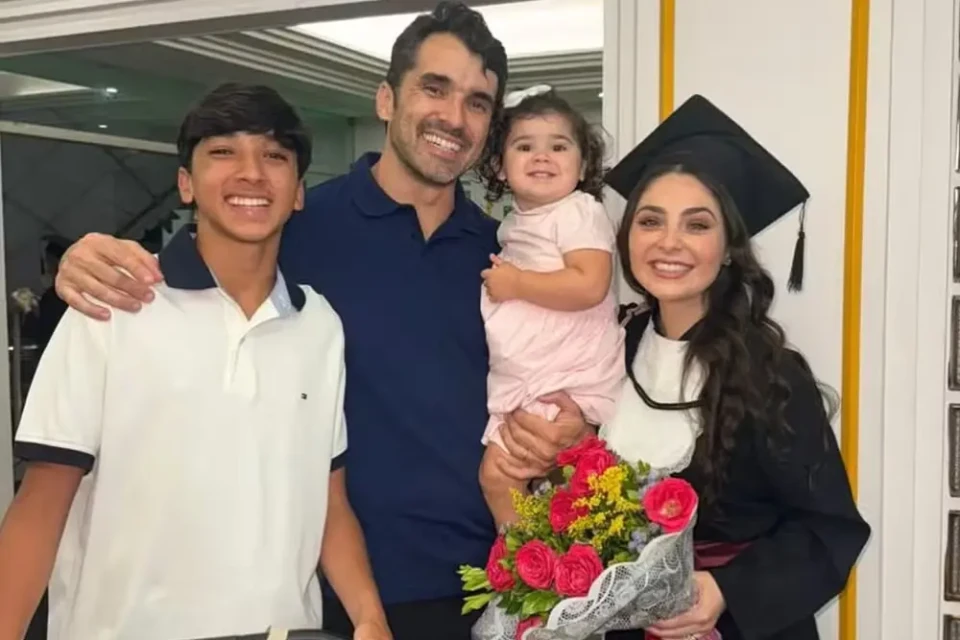 Durante a formatura, Marcela Barrozo posou ao lado do marido, o advogado Luiz Fernando Pinto, e da filha do casal, Luiza, nascida em maio de 2024.