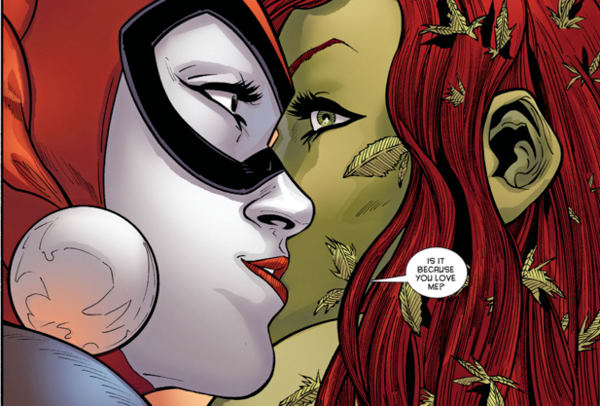 Pouca gente sabe (ou se lembra), mas tanto nos Novos 52 quanto nas HQs anteriores, a primeira pessoa com que a Arlequina se envolveu amorosamente após romper com o Coringa foi sua melhor amiga: a Hera Venenosa. Ao longo dos últimos anos, este é um caso que vem e vai: às vezes elas são só amigas, às vezes são mais que isso. O que importa é que essa amizade colorida envolve uma das personagens mais populares da DC atualmente e que é cânone até mesmo em outros universos da editora, como em Injustice e DC’s Bombshells.