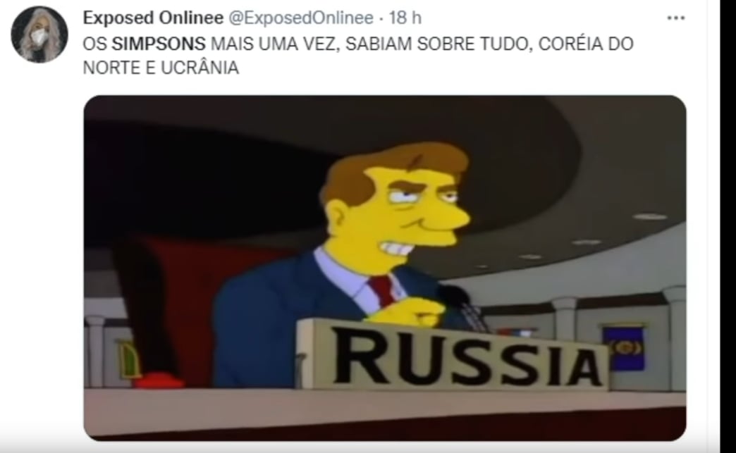 A última dessas foi a invasão da Ucrânia pela Rússia na semana passada. Vários internautas lembraram um episódio de “Os Simpsons” de 1998 em que a Rússia revelava que a União Soviética nunca foi de fato desmantelada, surpreendendo os representantes de um encontro diplomático, e iniciava uma ofensiva para retomar seus antigos territórios.