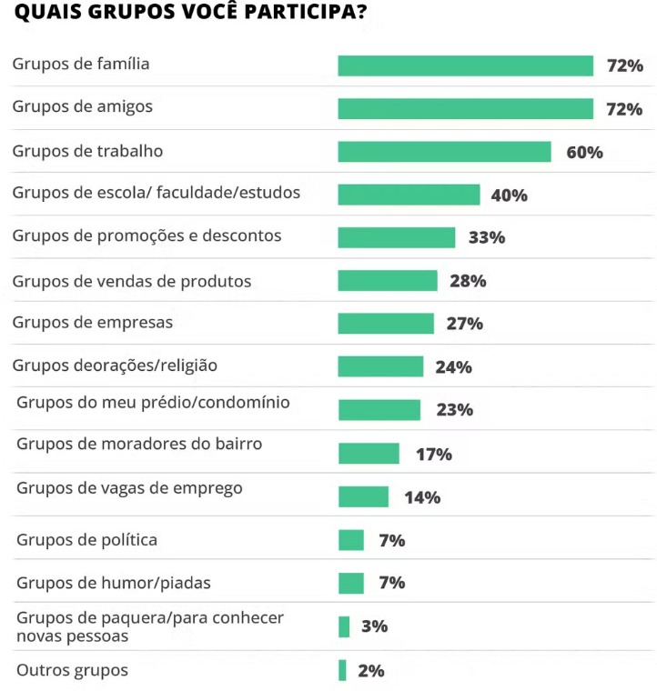 Outro dado relevante é a participação em grupos. Cerca de 94% dos brasileiros afirmam fazer parte de pelo menos um grupo no aplicativo, sendo os mais comuns os grupos de família e amigos, ambos com 72% de adesão. Grupos de trabalho também são expressivos, reunindo 60% dos usuários, enquanto grupos relacionados a estudos e promoções são citados por 40% e 33%, respectivamente.