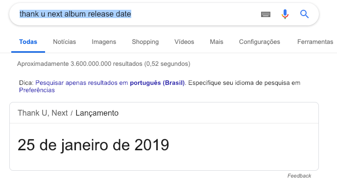 Ariana Grande está a todo vapor. Menos de seis meses depois de lançar o disco Sweetener, a cantora já estaria planejando um novo disco para o dia 25 de janeiro de 2019. Pelo menos, é o resultado que aparece quando pesquisamos o lançamento do álbum thank u next no Google.