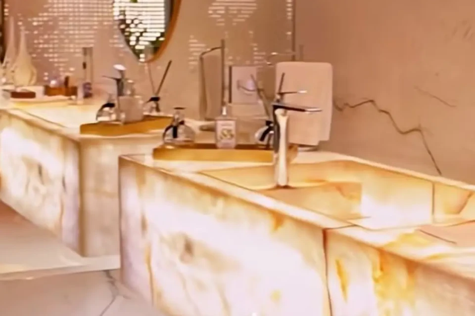 O que mais impressiona é a quantidade de mármore — de vários tons — presente em praticamente todos os ambientes. O destaque vai para um lavabo monumental, que mais parece um salão de festas, tanto pelo tamanho quanto pela sofisticação. O espaço, que é um dos preferidos de Andréa e também dos visitantes, tem uma pia enorme, espelho gigante e até uma antessala com sofás para receber convidados.