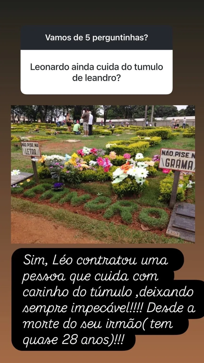 “Leonardo ainda cuida do túmulo de Leandro?”, escreveu o seguidor. Poliana respondeu: “Sim, Léo contratou uma pessoa que cuida com muito carinho do túmulo, deixando sempre impecável.”