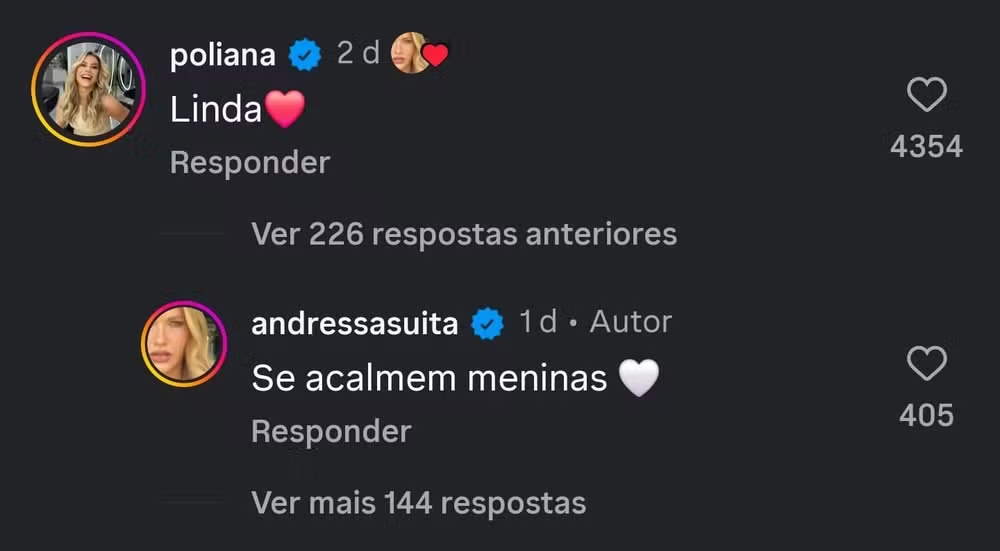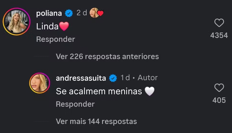 Entre as críticas, algumas pessoas chamaram Poliana Rocha de “cobra” e apontaram que ela estaria alimentando rivalidade entre as duas. Diante da repercussão, Andressa Suita resolveu se pronunciar para acalmar os ânimos e escreveu: “Se acalmem, meninas.”