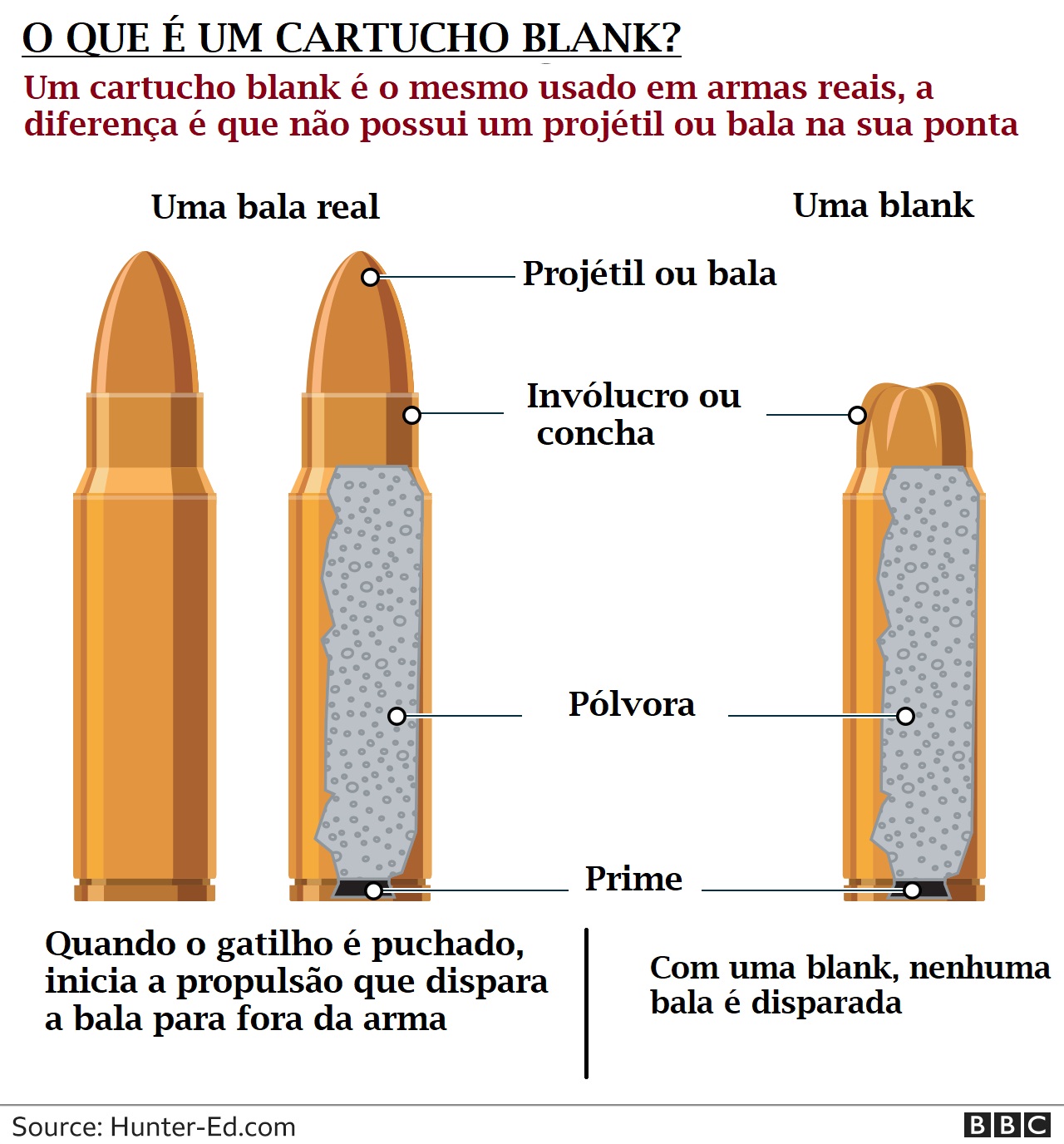 Embora o termo “bala” seja comumente usado para descrever o que é carregado nas armas, mais apropriadamente é um cartucho que é carregado: um pacote de munição independente feito de um invólucro contendo um pó explosivo que, quando disparado, lança um projétil ou marcador. Blanks se diferenciam porque embora usem explosivos, não usam projéteis.