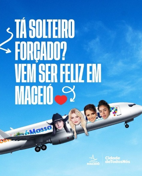 A prefeitura de Maceió usou uma imagem com os rostos das mais novas solteiras Sandy, Luísa Sonza, Ana Castela e Bella Campos num avião para promover as belezas naturais do município de Alagoas. “Maceió é a capital do amor, mas ser solteiro aqui também é bom demais”, diz a postagem.
