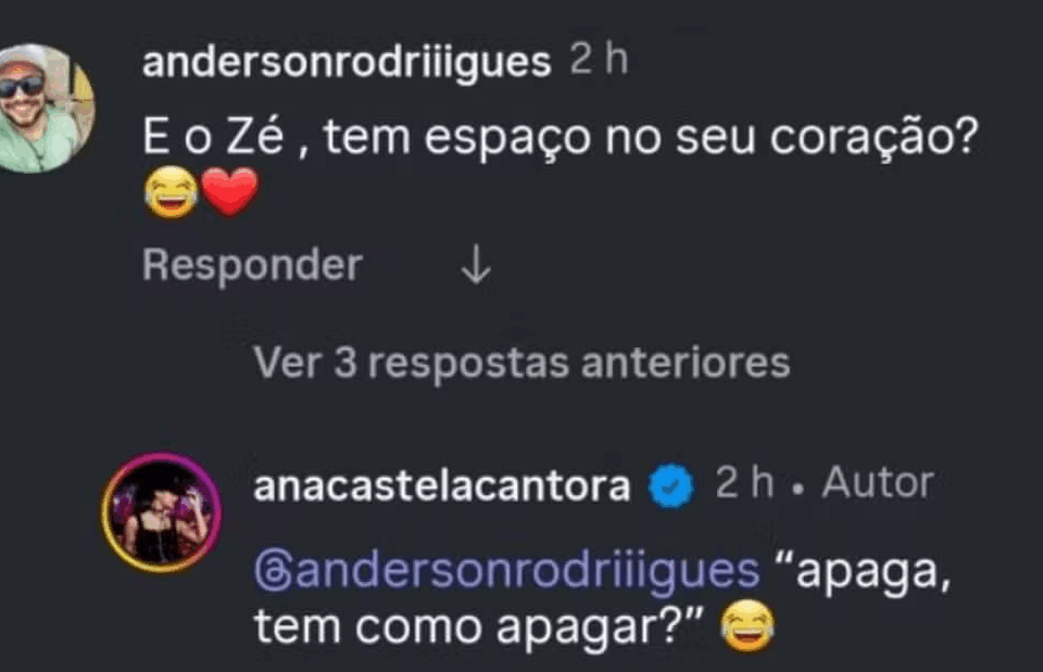 - Brincadeira no Instagram: depois da repercussão, um fã voltou a questionar o relacionamento. A cantora respondeu em tom de deboche: “Apaga, tem como apagar?”.