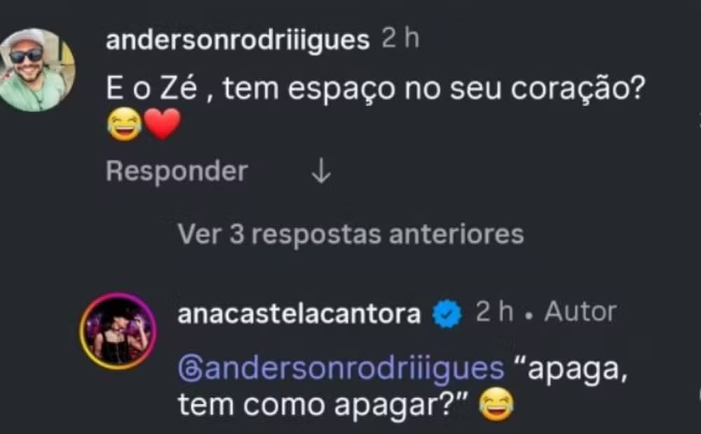- Brincadeira no Instagram: depois da repercussão, um fã voltou a questionar o relacionamento. A cantora respondeu em tom de deboche: “Apaga, tem como apagar?”.