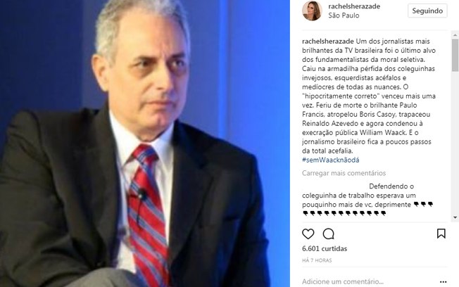 Em um texto publicado em suas redes sociais, Sheherazade comentou que Waack foi vencido pelo “hipocritamente correto” e condenado à “execração pública”. “(William) caiu na armadilha dos coleguinhas invejosos, esquerdistas acéfalos e medíocres de todas as nuances”, escreveu ela.