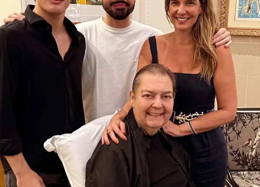 Na imagem, Fausto Silva, de 75 anos, surge sorridente e sentado em uma cadeira de rodas, ao lado do aniversariante, da esposa Luciana Cardoso e do filho caçula, Rodrigo Silva, de 17 anos.
